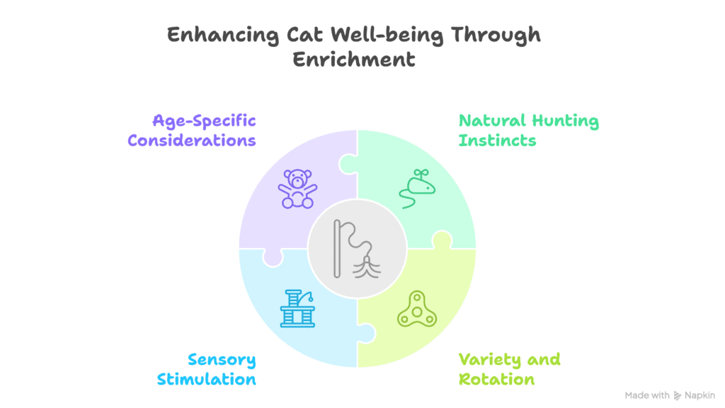 Natural hunting instincts drive most successful enrichment activities. Cats are hardwired for a sequence behaviorists call “hunt, catch, kill, eat, groom, sleep.” Indoor cats rarely get to complete this cycle, leading to frustration and behavioral issues. Effective enrichment activities allow cats to express these instincts safely: stalking toys, pouncing on targets, carrying prey, and feeling successful about their “hunt.”